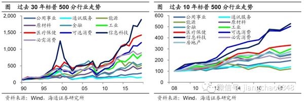 美国消费强劲增长,在资本市场表现亮眼。回顾90年以来标普500各行业涨幅,与高端消费相关的信息科技、医疗保健分别以18.9倍、14.2倍领跑,可选消费和必需消费以12倍和8.9倍紧随其后,表现均远好于与工业投资相关的工业、能源、原材料,也强于金融、地产。而观察过去十年各行业表现,信息科技、可选消费、医疗保健依然领跑。