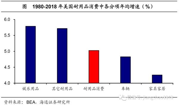 非耐用品多数下滑,药品、个人护理等商品占优。在非耐用消费品中,传统的食品、衣着类消费增长尤为缓慢,1980-2018年间两者年均增速均不足4%,包含汽油等在内的能源品消费增速同样不高。而在非耐用品消费增长普遍下滑的背景之下,药品、玩具和宠物用品和个人护理用品等其它非耐用品类实现了较为快速的增长,其在这一时期年均增速近6%,甚至快于耐用品消费的增长速度。