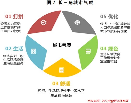 在此,我们根据就业、环境、生活,采用雷达图将长三角城市气质分为以下五种: