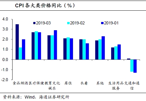 从同比来看,由于去年同期非食品价格环比下降0.4%,3月非食品同比小幅回升至1.8%,影响CPI上涨约1.46个百分点。其中医疗保健、教育文化和居住价格依然涨幅靠前,交通和通信价格由跌转涨。