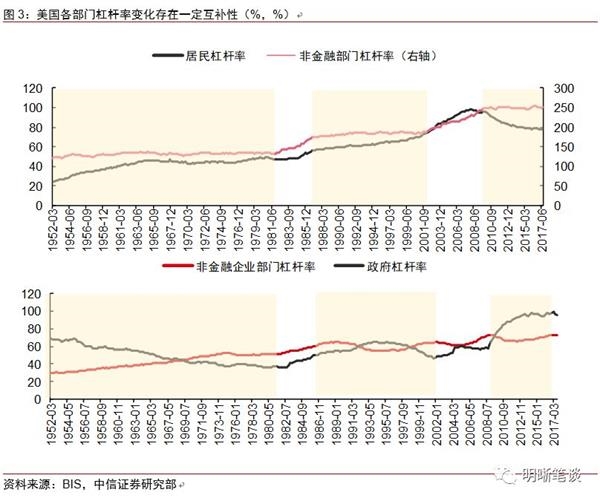 而美国各部门杠杆率变化互补性高。与中国情况相对应的是美国各部门杠杆率互补性较强,美国企业、居民、政府部门杠杆率增速存在明显的互补特征,尤其是政府部门与企业部门杠杆率增速的互补特征显著。