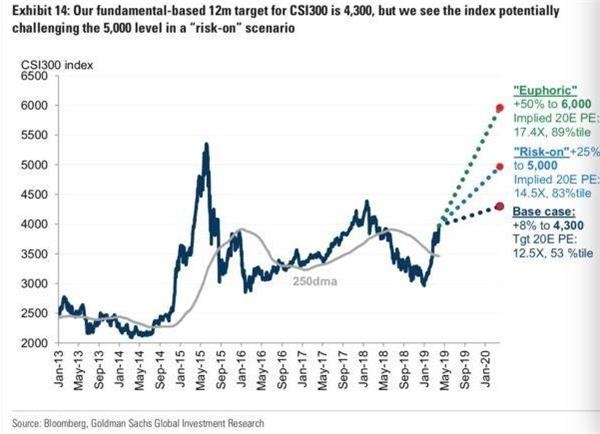 高盛认为,保守地假设市场情绪回归到2015年和2018年的平均巅峰水平,这意味着沪深300指数还将有25%的上行空间,即5000点。
